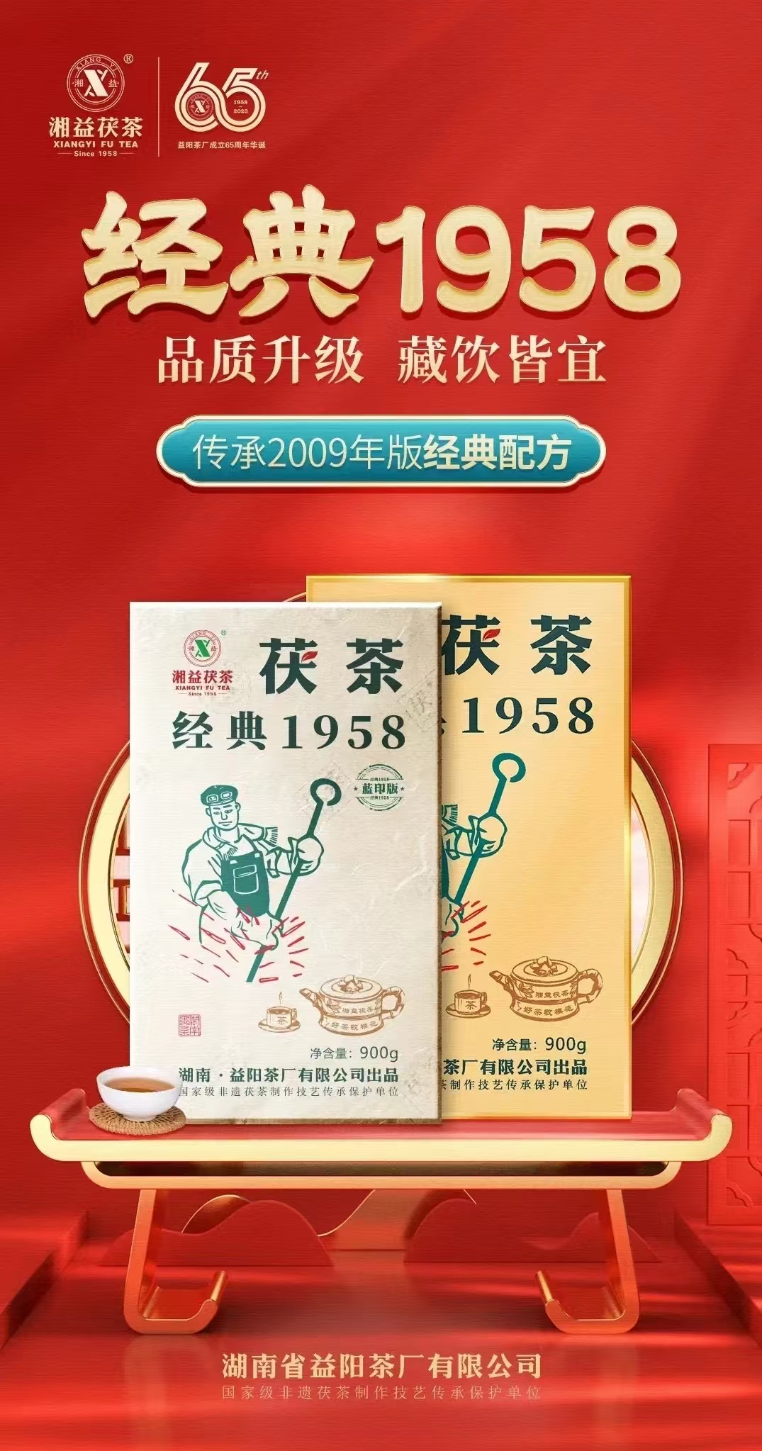 〖經典1958(藍?。┸虿琛窖永m了之前經典古樸的包裝風格。茶磚采用湘益食品級防偽綿紙精心呵護,層層保護茶葉本真。其環保性和透氣性更利于茶品后期持續轉化升華。